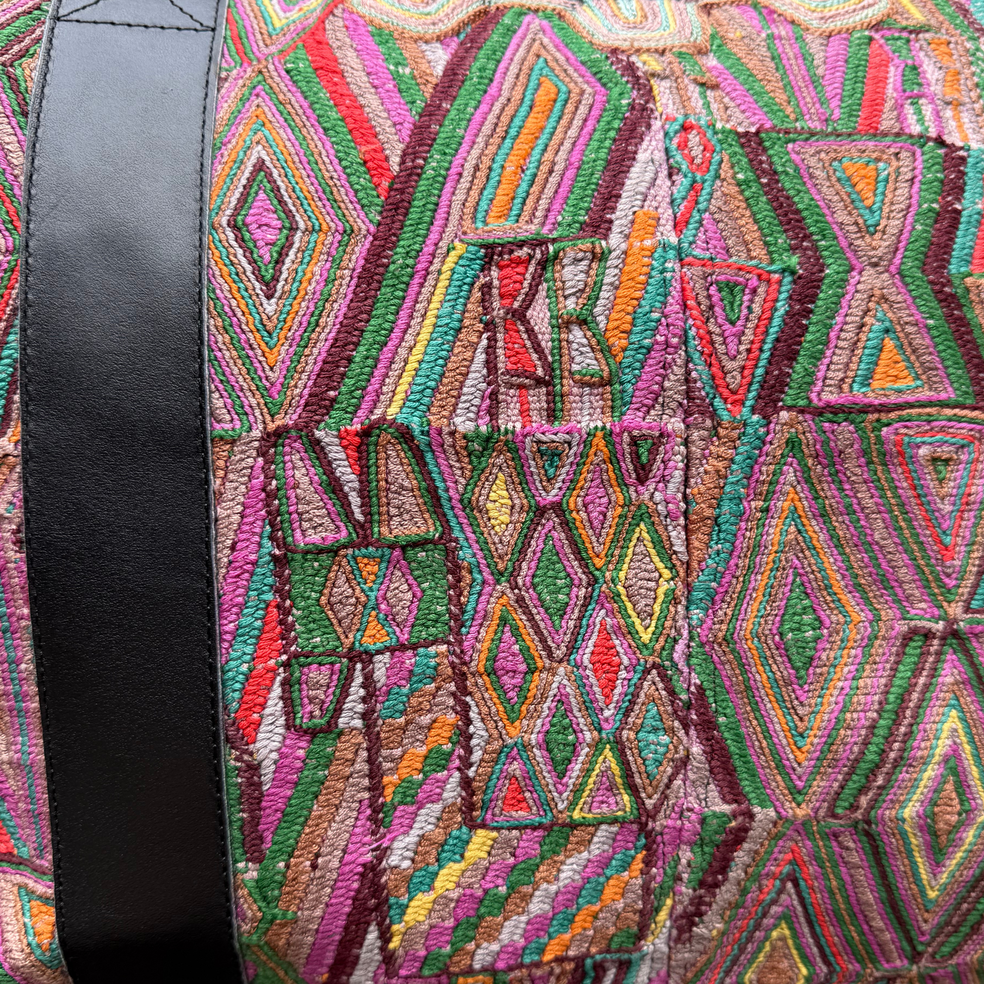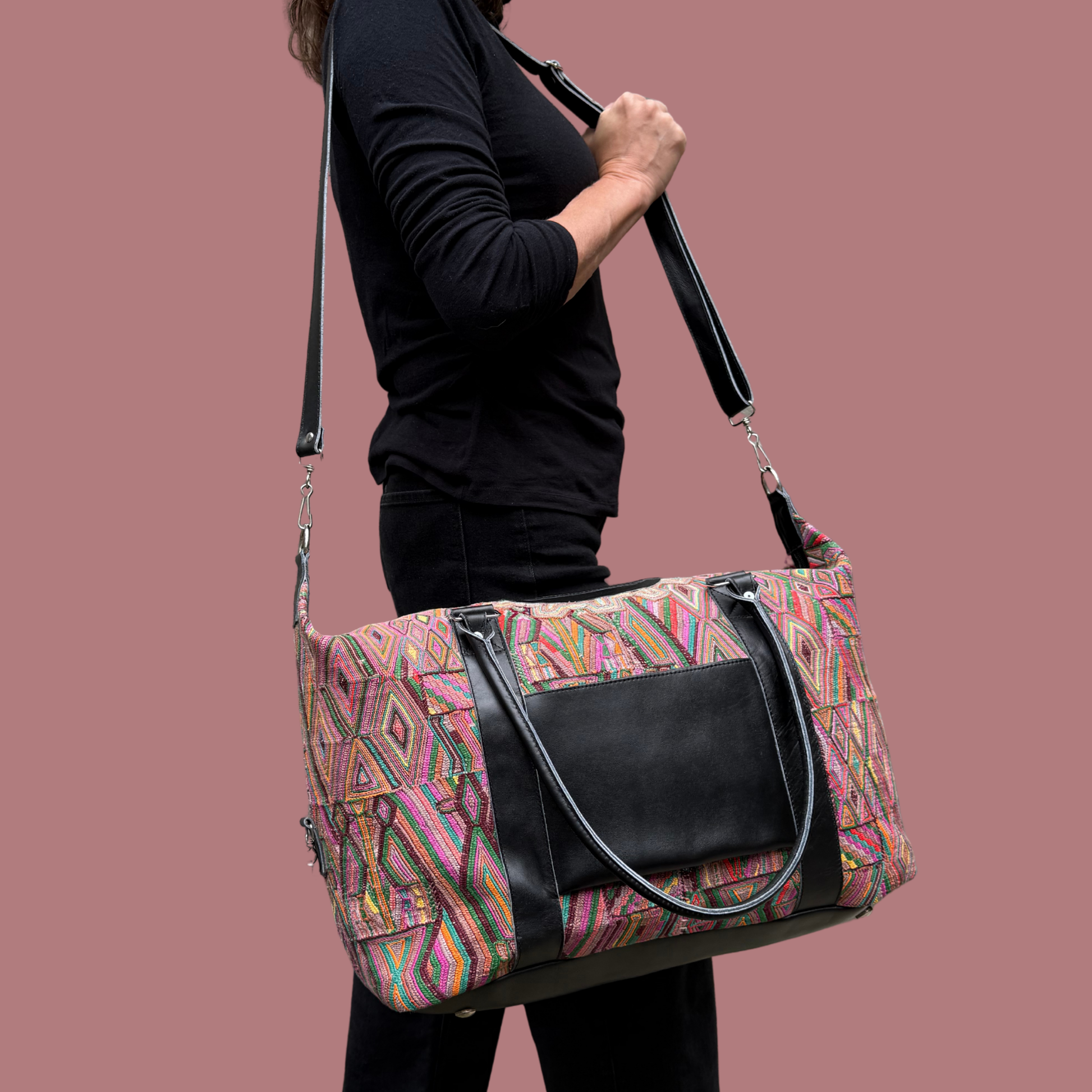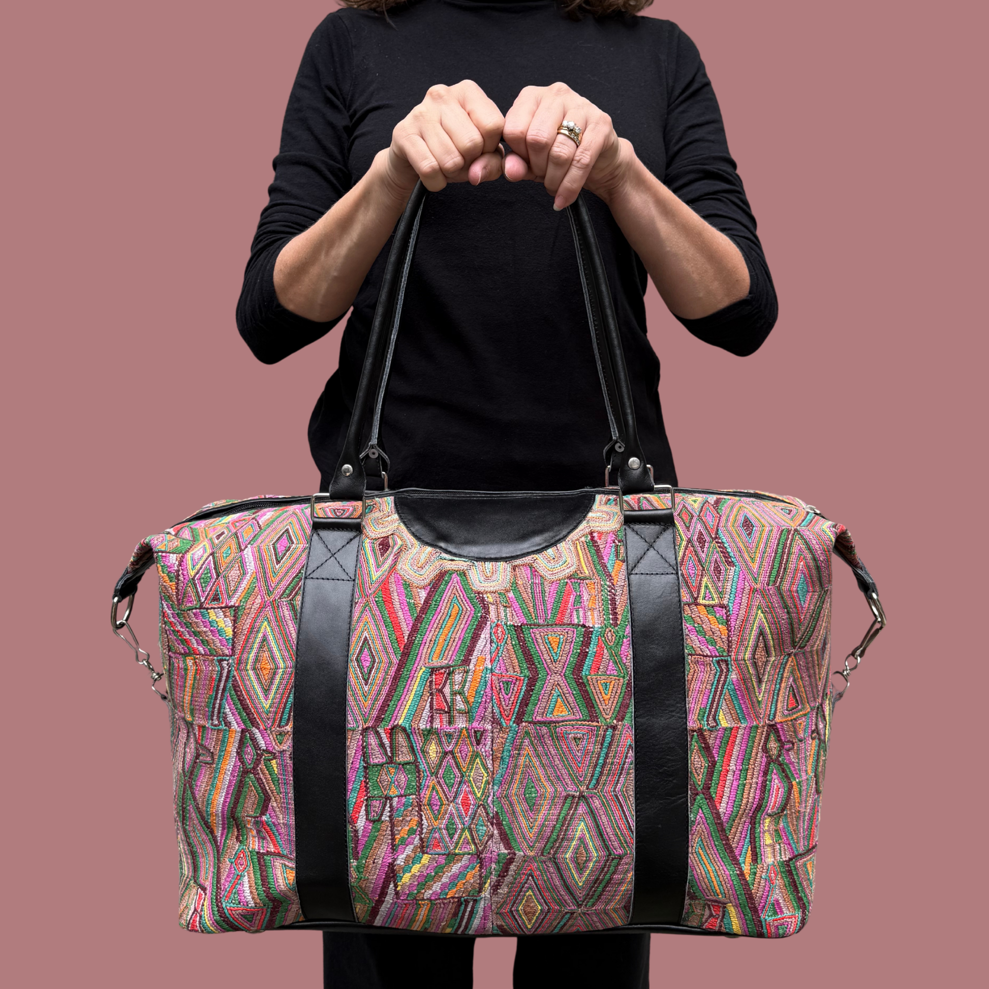 When Intertwined's Huipil Weekender is a smidge too large, choose our Huipil Mini-Weekender. It carries all your essentials and fits under the seat on a plane, attaching to your roller bag with its trolley sleeve. Stunning handwoven vintage huipils are turned into beautiful bags by skilled leather artisans in Guatemala. (Just in case you were wondering, a huipil is a Mayan blouse!)
