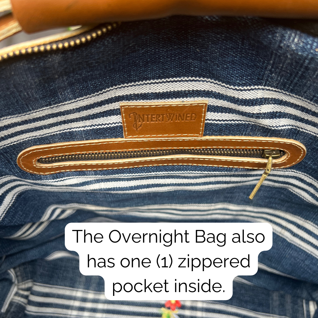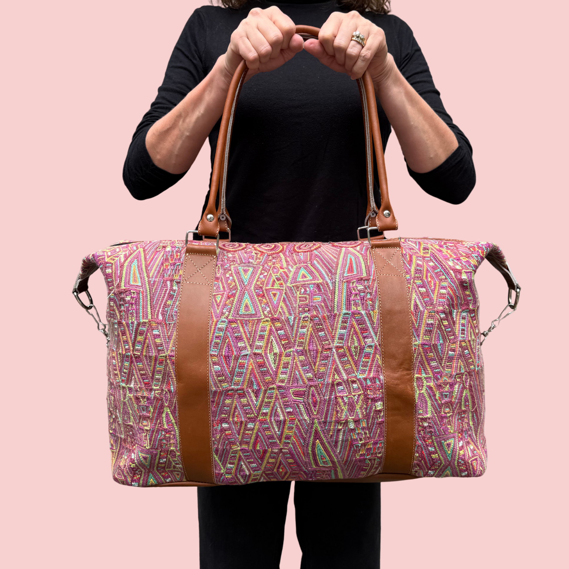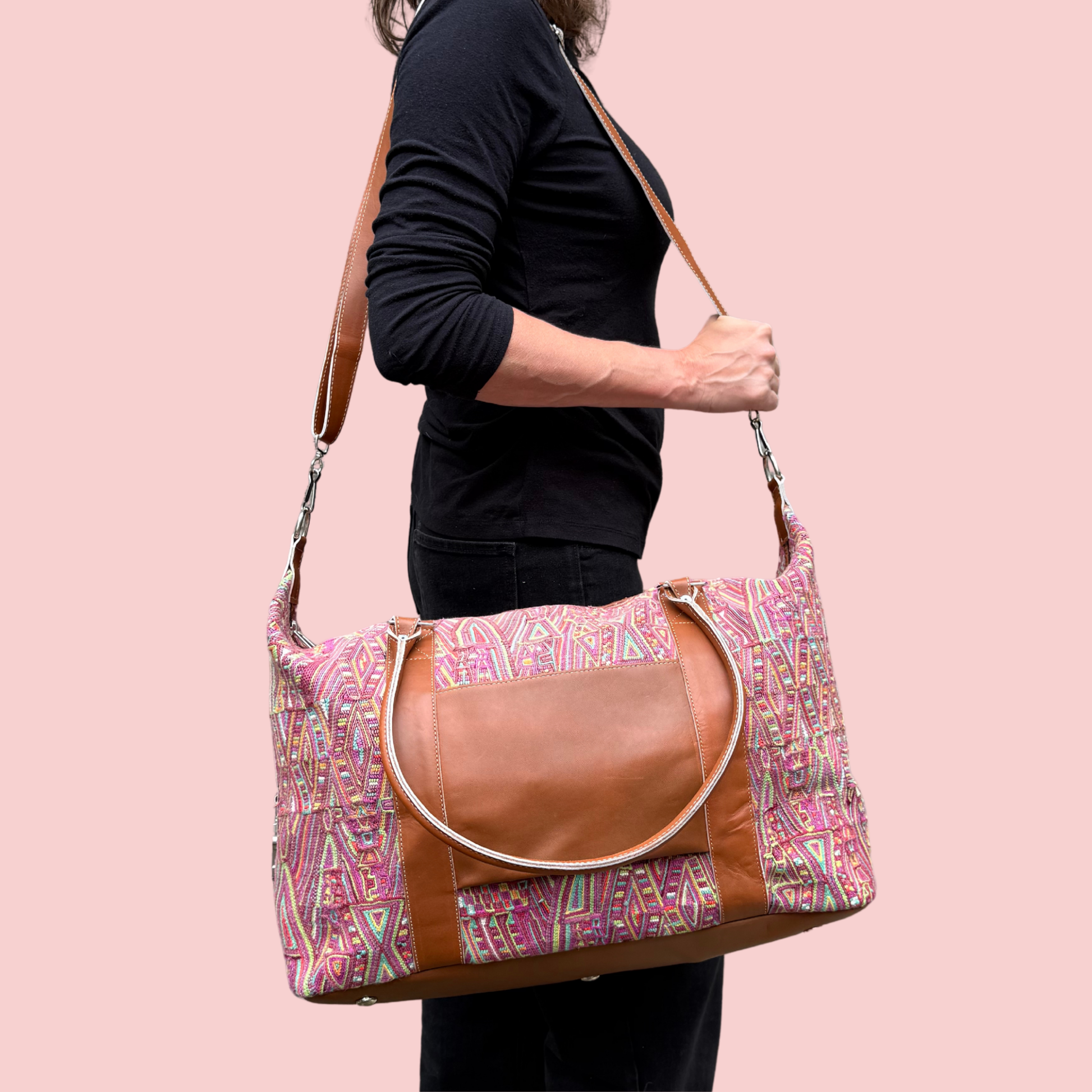 When Intertwined's Huipil Weekender is a smidge too large, choose our Huipil Mini-Weekender. It carries all your essentials and fits under the seat on a plane, attaching to your roller bag with its trolley sleeve. Stunning handwoven vintage huipils are turned into beautiful bags by skilled leather artisans in Guatemala. (Just in case you were wondering, a huipil is a Mayan blouse!)
