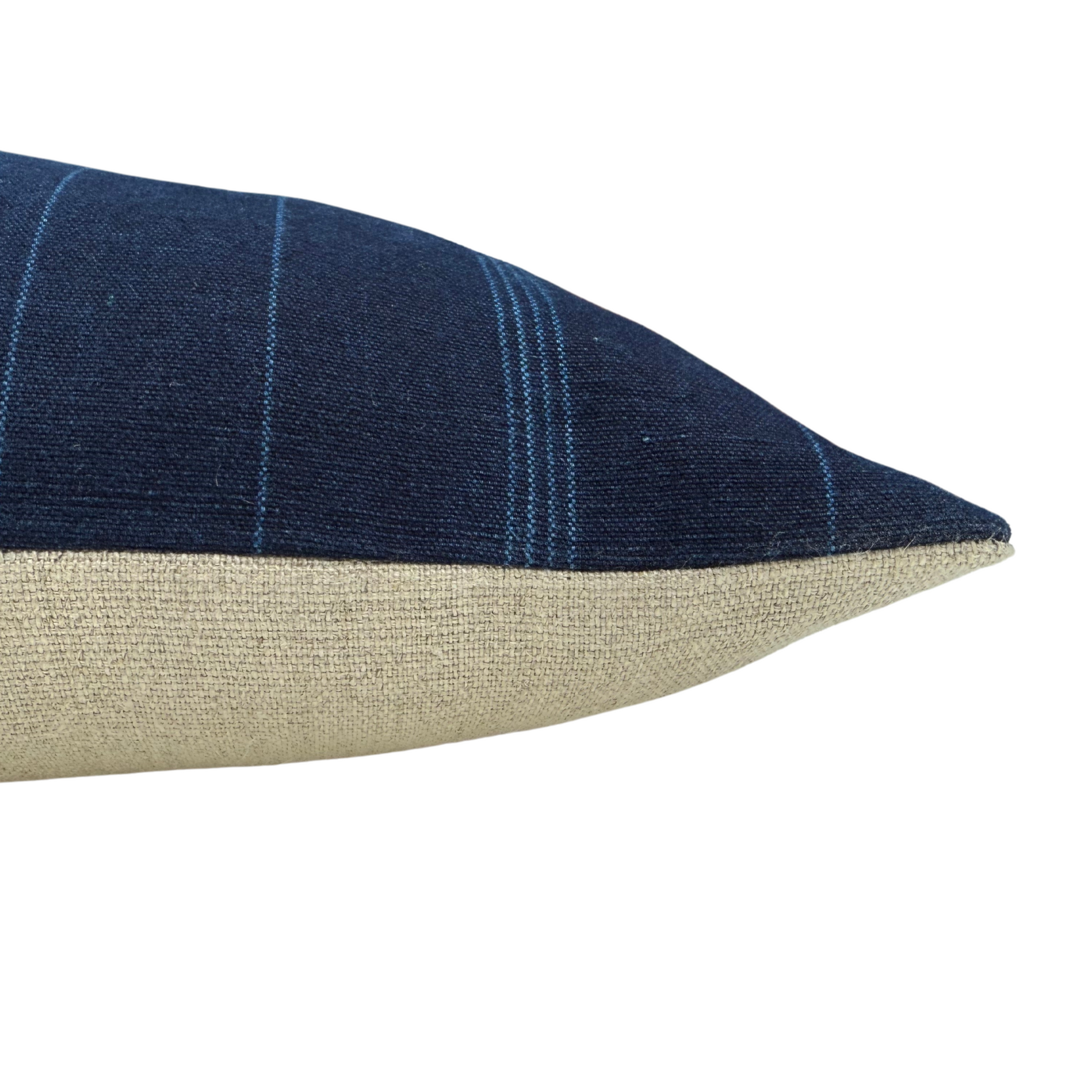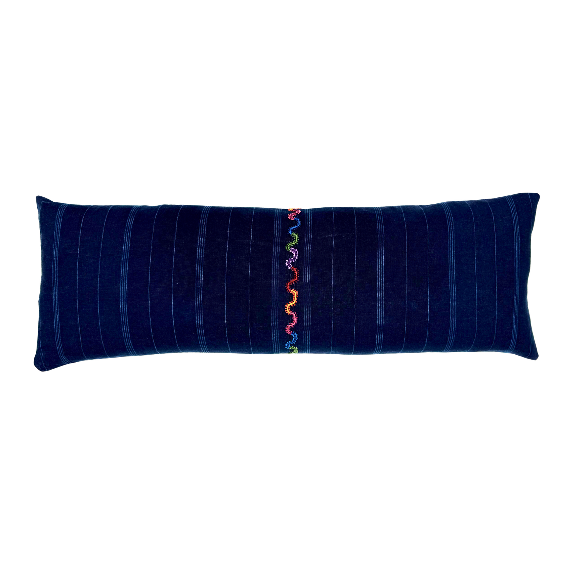 Add a touch of history, sustainability, and global craftsmanship to your home with this stunning indigo long lumbar pillow, handmade from vintage textiles and ethical materials. The front features handwoven denim sourced from a traditional Guatemalan corte skirt, giving each piece a unique blend of rich indigo tones and cultural heritage. The back is made from natural super-soft hemp fabric, grown in India by The Hemp Foundation. This long lumbar pillow is perfect for your bed or across a cozy bench or sofa. Each one is sewn with care by Afghan refugee women resettled in North Carolina, providing meaningful employment and a new beginning.