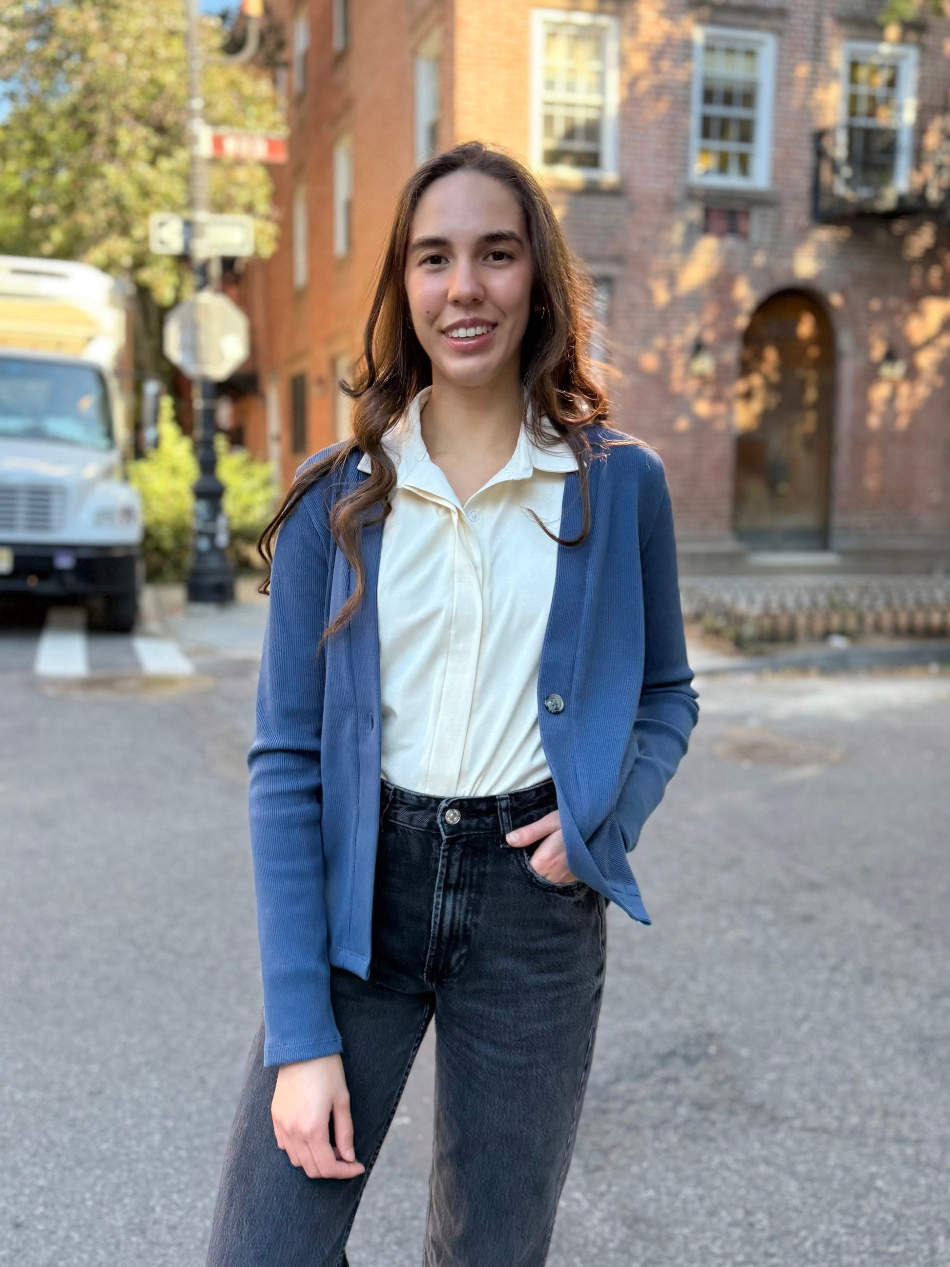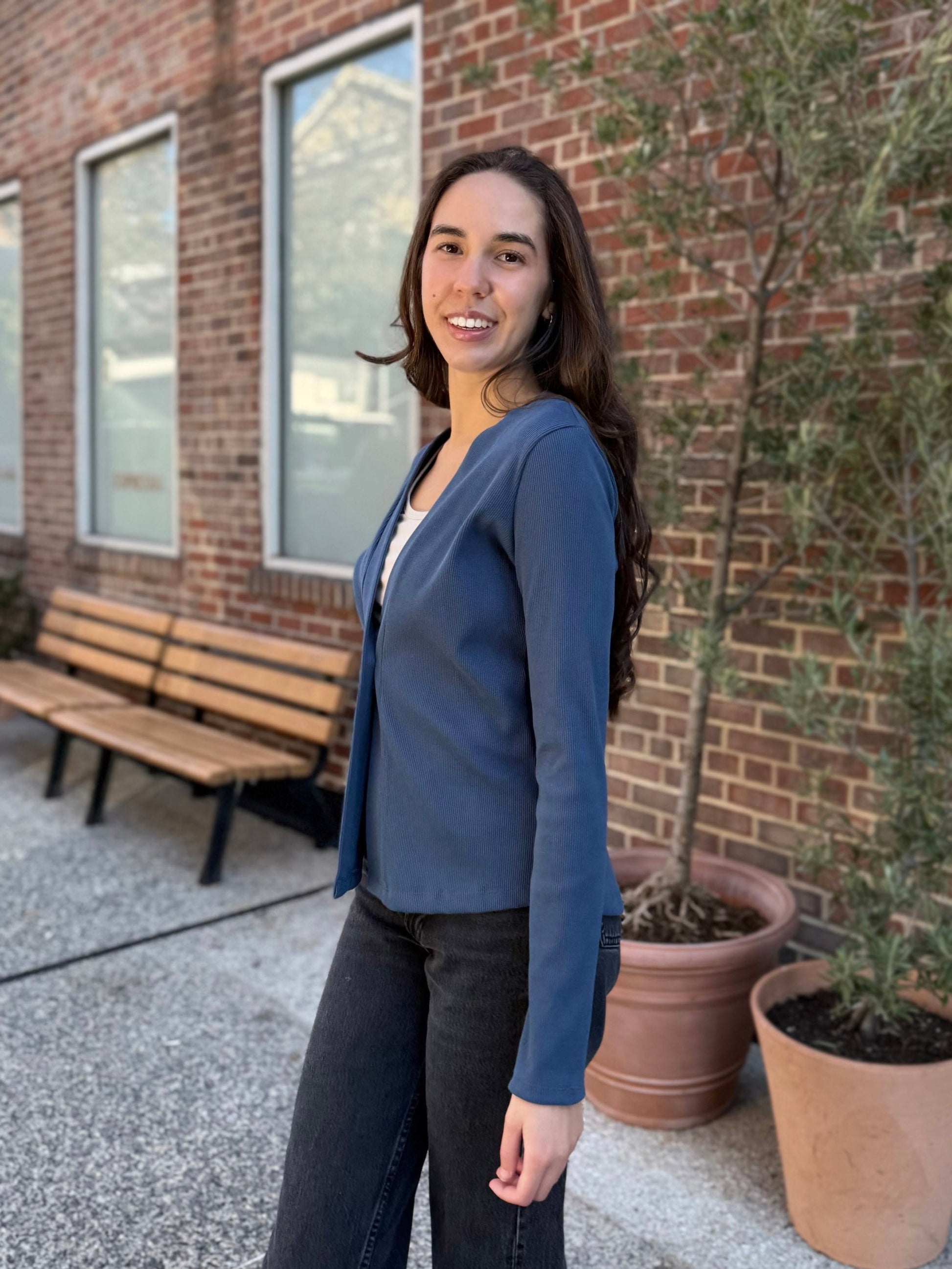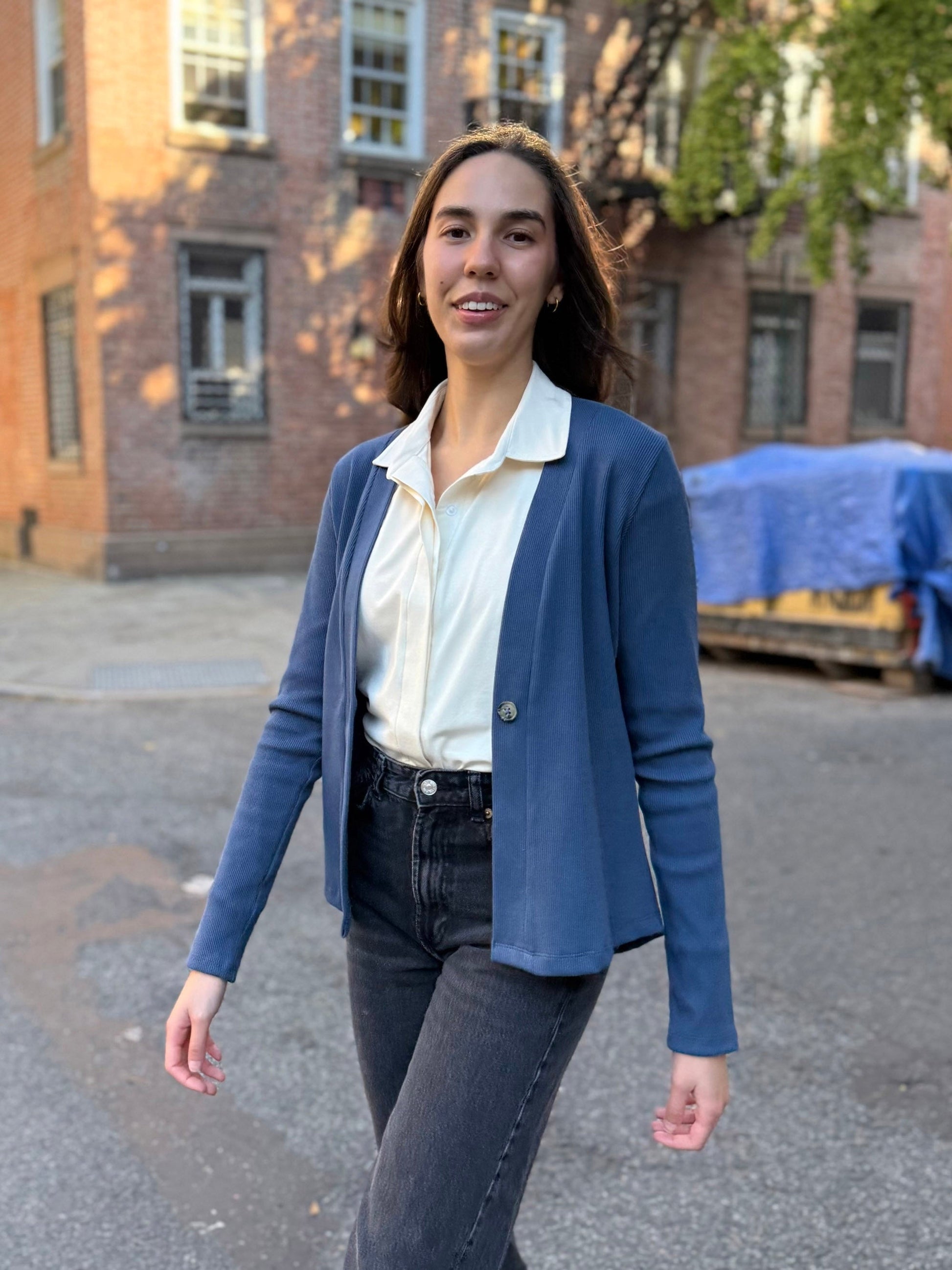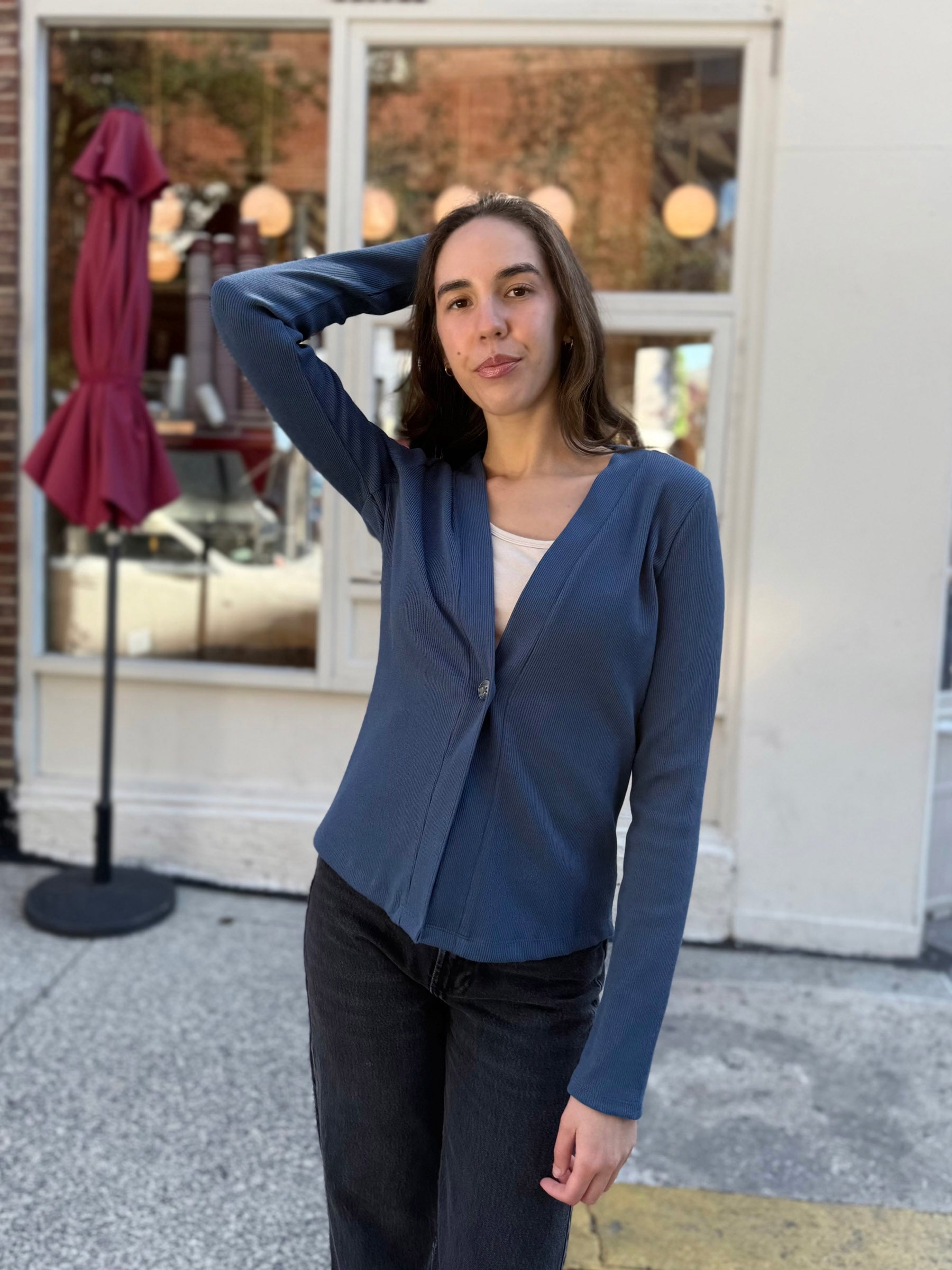 JUDE rib-knit fitted cardigan in Faded Navy