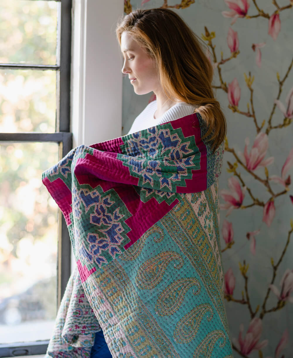 • Size: 54" x 74" • Materials: 6 layers of vintage cotton saris • Patchwork or beautiful small imperfections may be present due to the nature of vintage fabrics • Handcrafted by a skilled woman artisan in Ajmer, India • Features the hand-stitched name of the maker on the tag Machine wash cold with mild detergent. Tumble dry low. Do not bleach. Warm iron, if desired. All orders will ship within 1-3 business days from their studio in Louisville, KY. Express orders are expedited and shipped within 1 business day. Economy orders, shipped via UPS Ground or USPS Ground Advantage, typically arrive in 1-5 business days based on destination. Express orders are sent via UPS Next Day Air and arrive within 1-2 business days. Domestic economy shipping is free on orders over $275. Anchal accepts exchanges and returns within 14 days of the delivery date. Exchanges and returns for store credit are free. Returns for refund are subject to a $10 flat rate return shipping fee if approved.