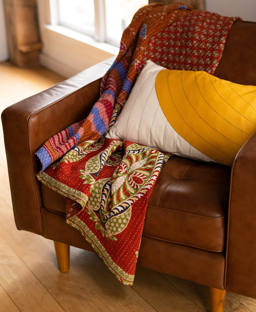 • Size: 54" x 74" • Materials: 6 layers of vintage cotton saris • Patchwork or beautiful small imperfections may be present due to the nature of vintage fabrics • Handcrafted by a skilled woman artisan in Ajmer, India • Features the hand-stitched name of the maker on the tag Machine wash cold with mild detergent. Tumble dry low. Do not bleach. Warm iron, if desired. All orders will ship within 1-3 business days from their studio in Louisville, KY. Express orders are expedited and shipped within 1 business day. Economy orders, shipped via UPS Ground or USPS Ground Advantage, typically arrive in 1-5 business days based on destination. Express orders are sent via UPS Next Day Air and arrive within 1-2 business days. Domestic economy shipping is free on orders over $275. Anchal accepts exchanges and returns within 14 days of the delivery date. Exchanges and returns for store credit are free. Returns for refund are subject to a $10 flat rate return shipping fee if approved.