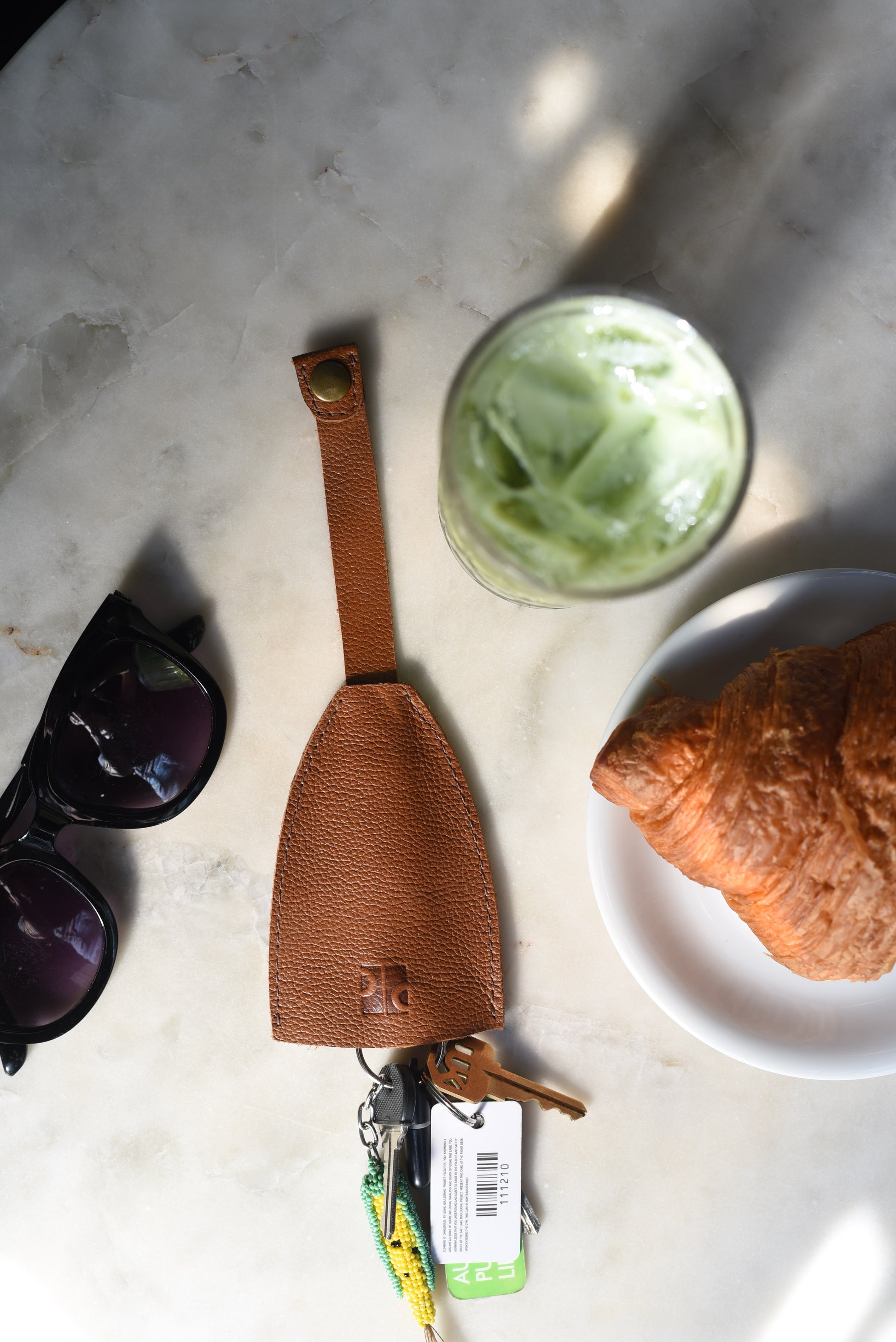 Tired of your keys scratching everything in your bag? Our Key Holder in Pebbled Cognac Leather keeps them tucked safely away. Clip your keys inside, slide them into the leather sleeve & snap it in for quick access without the bulk.