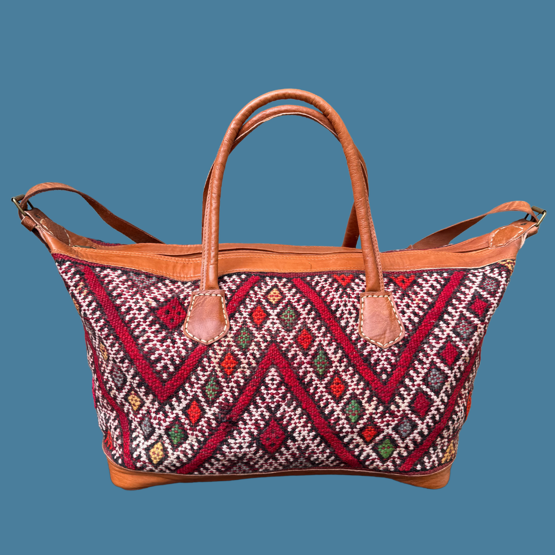 Handcrafted in Morocco by skilled artisans, this stylish and durable weekender bag features sustainably sourced, vegetable-tanned Moroccan leather paired with vibrant vintage kilim—each handwoven with distinctive patterns and colors that reflect the cultural heritage of its region. No two bags are the same, making yours truly unique.