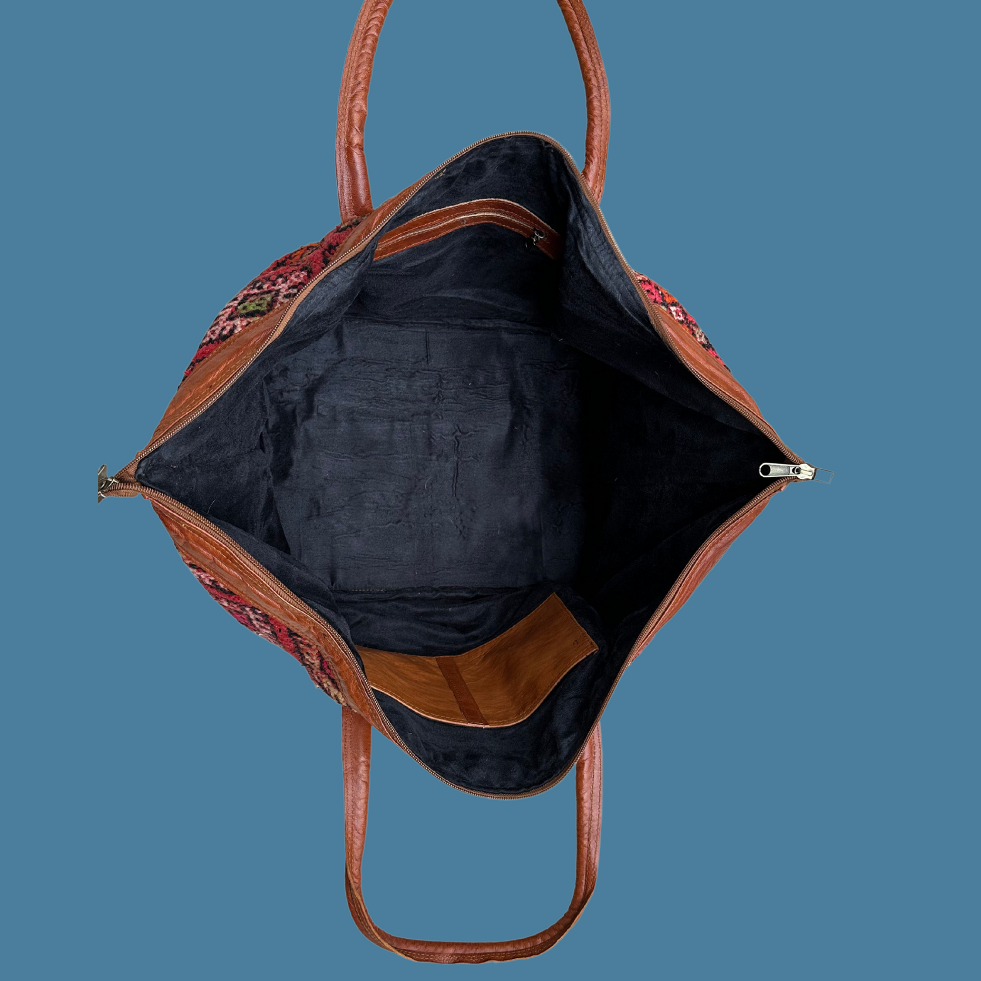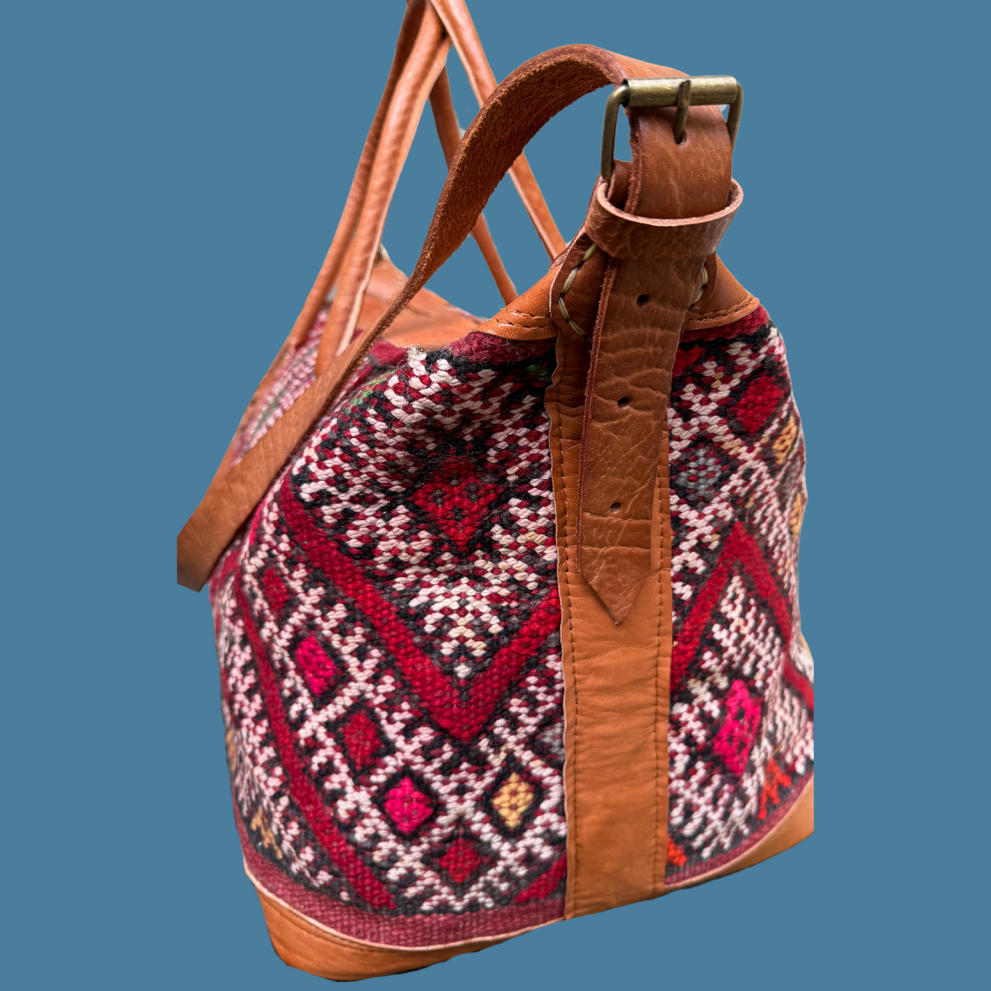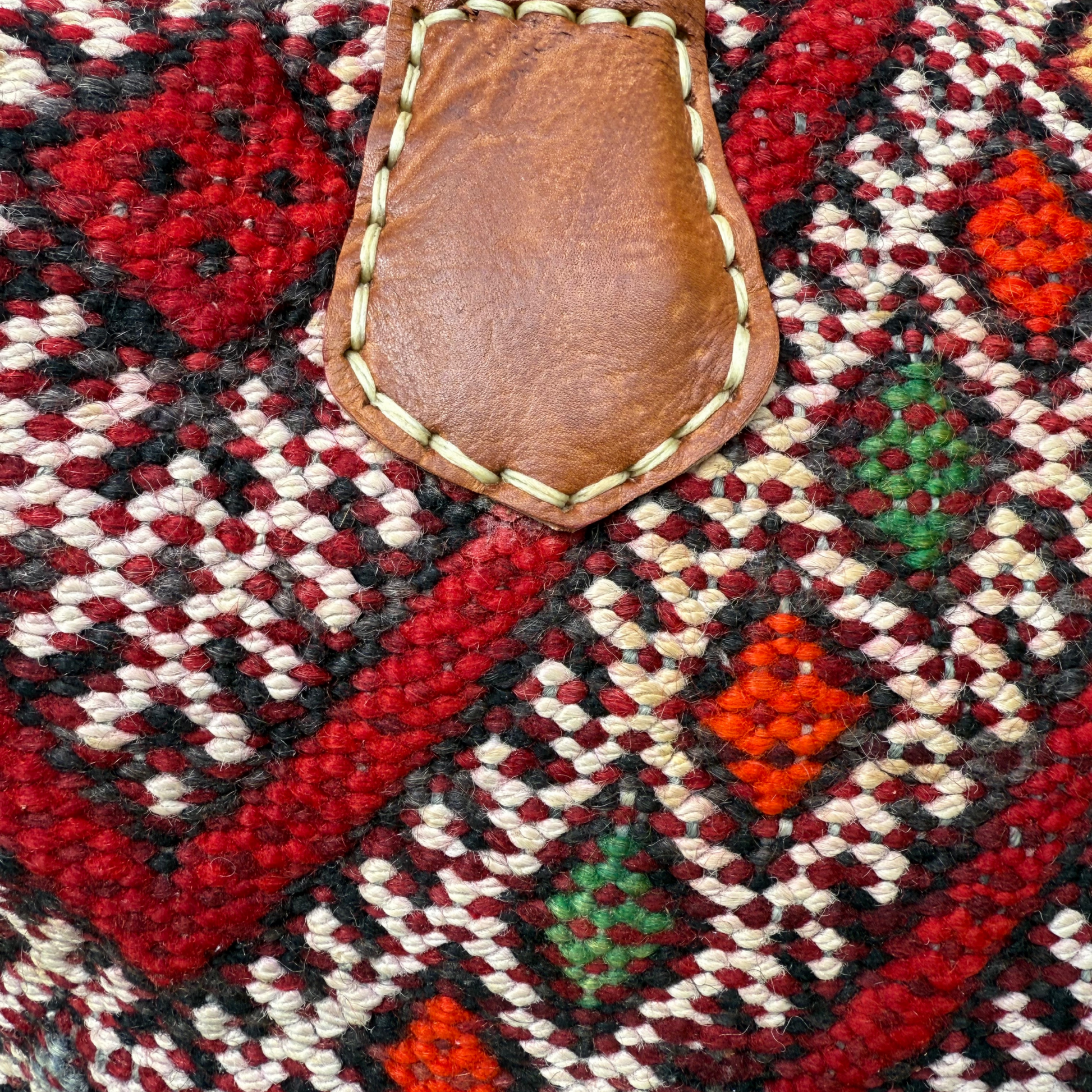 Moroccan sustainably sourced, vegetable tanned leather and wool vintage kilim.