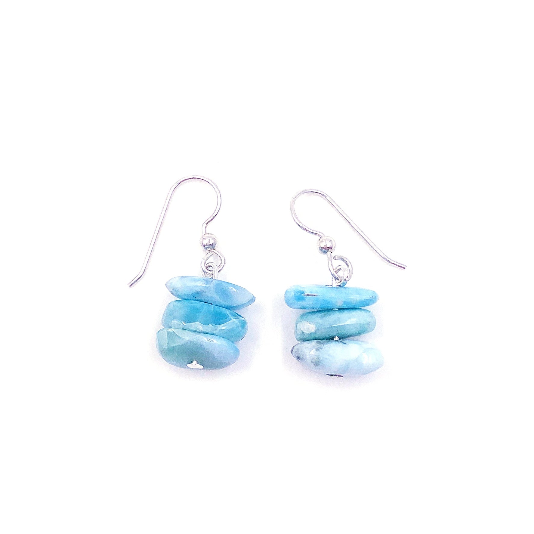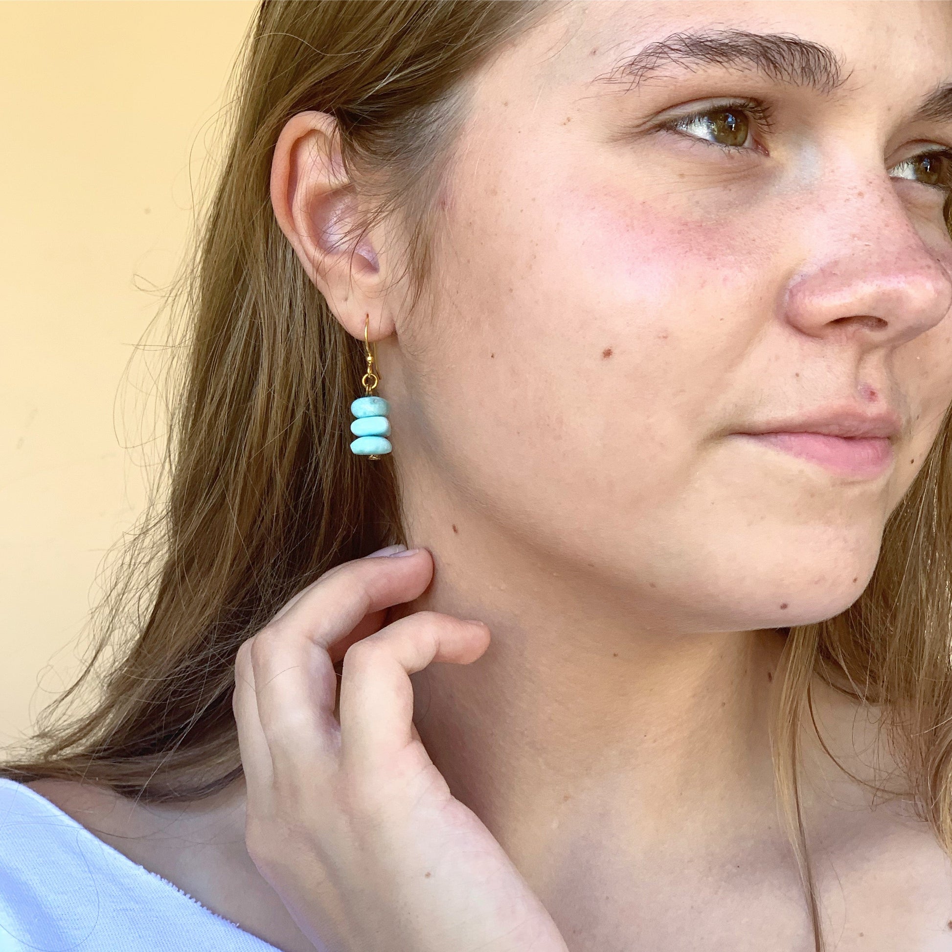 These Larissa Dangles are an ideal accessory for those who appreciate subtle but powerful pieces. Crafted from your choice of metal; sterling silver or polished brass, these earrings feature three stacked larimar beads for an understated, yet eye-catching look.