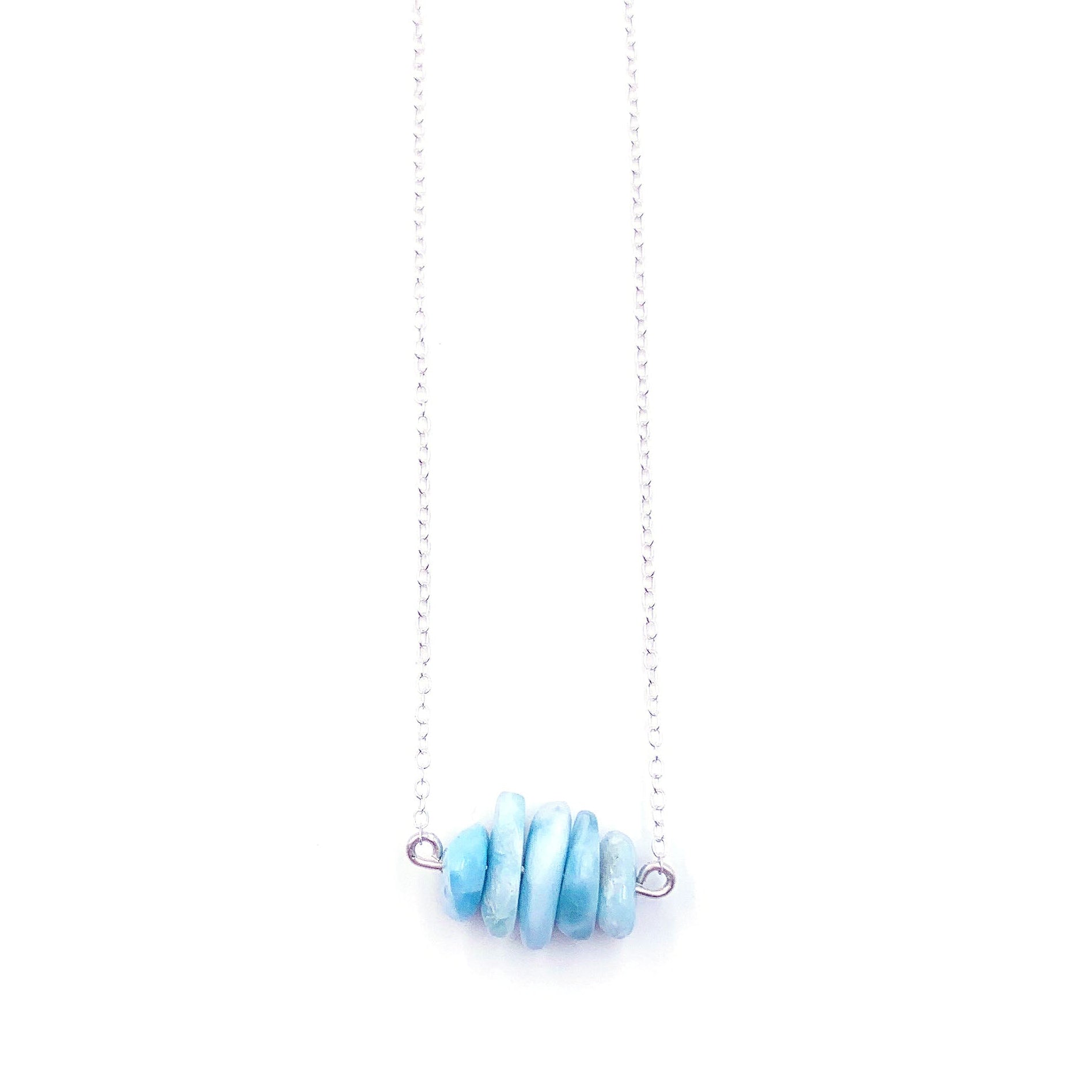 The Larissa Necklace is the classic, timeless piece you'll always reach for. Crafted with stacked larimar beads and your choice of metal. Choose from sterling silver or polished brass, this necklace is the perfect balance of simple and stunning. Whether you're looking to add the perfect touch of elegance to a casual outfit or complete a classic evening look, the Larissa Necklace is sure to be a wardrobe staple.
