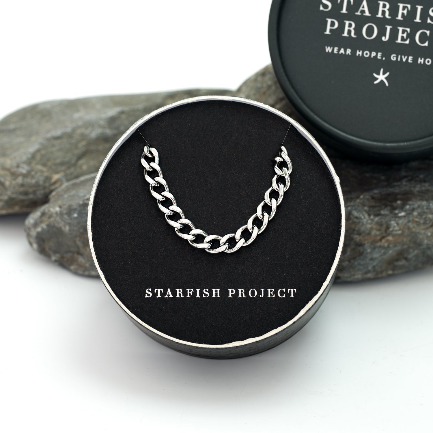 Our Linked Curb Chain is a classic made for every day and everyone. Style it solo or double up, either way, it's a strong impact maker. The sleek stainless steel links represent the strength of people like you and me, joining together to hope and fight for a better future for every woman. The 6mm Linked Curb chain featuring our signature starfish icon hinge closure will complete any look—minimal effort with maximum impact!