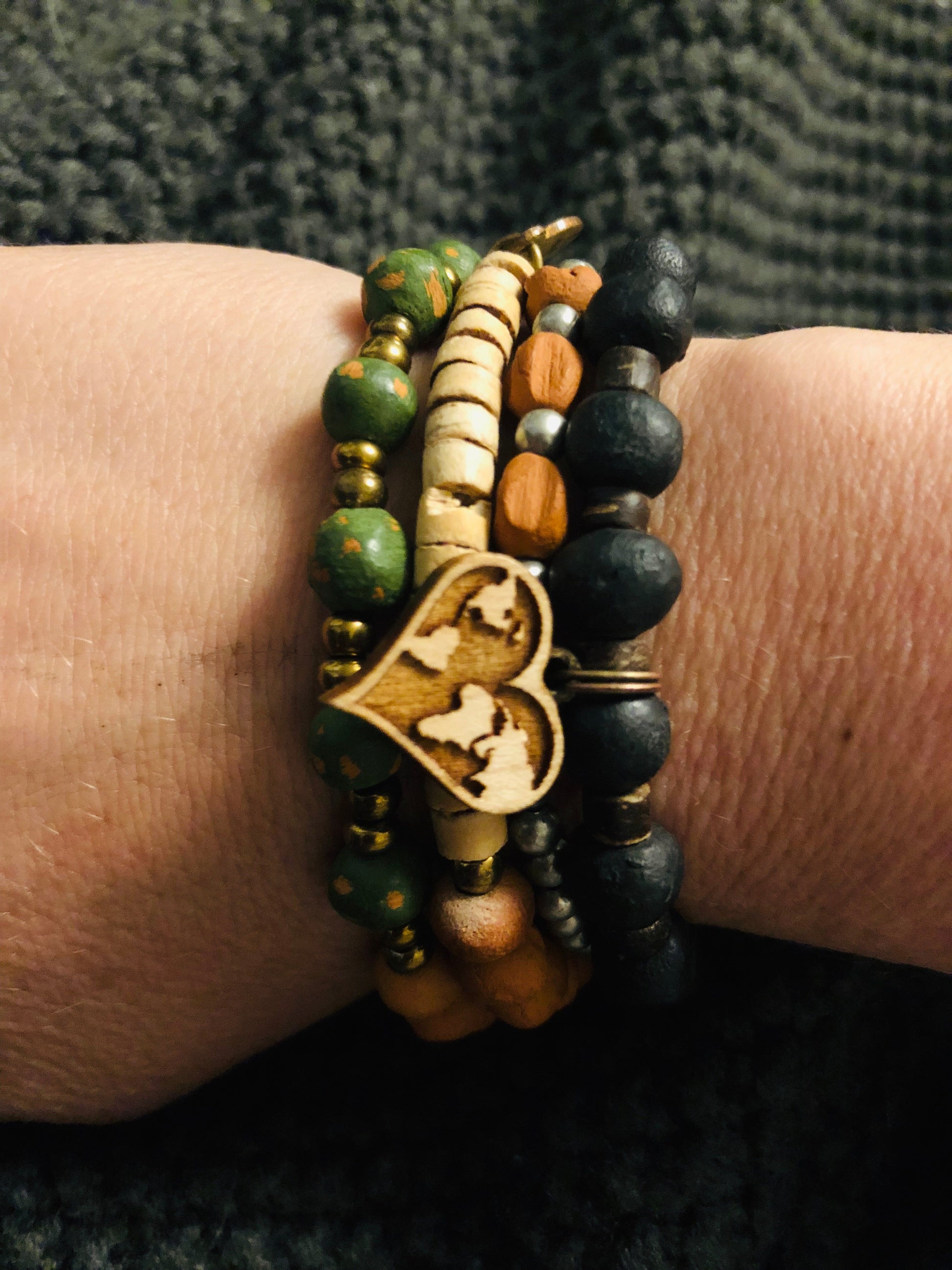 Handmade Haitian clay beads are fired with banana leaves to bring out natural tones and textures. This organic look is perfectly paired with a heart charm featuring a map of the world.