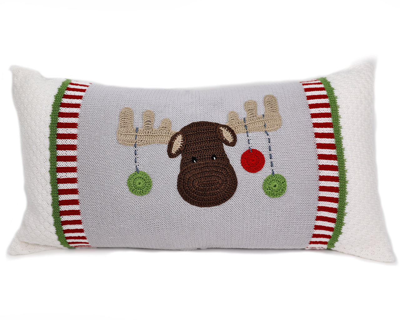 Bring a festive and cozy feel to your home with this charming knit holiday throw pillow. Featuring an adorable moose adorned with hanging ornaments on its antlers, this pillow captures the playful spirit of the season.