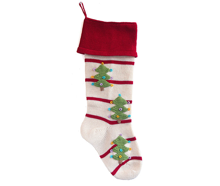 This ivory stocking is adorned with cheerful red stripes and embellished with three charming crocheted Christmas trees, each decorated with colorful ornaments, bringing a joyful burst of color to your holiday décor.