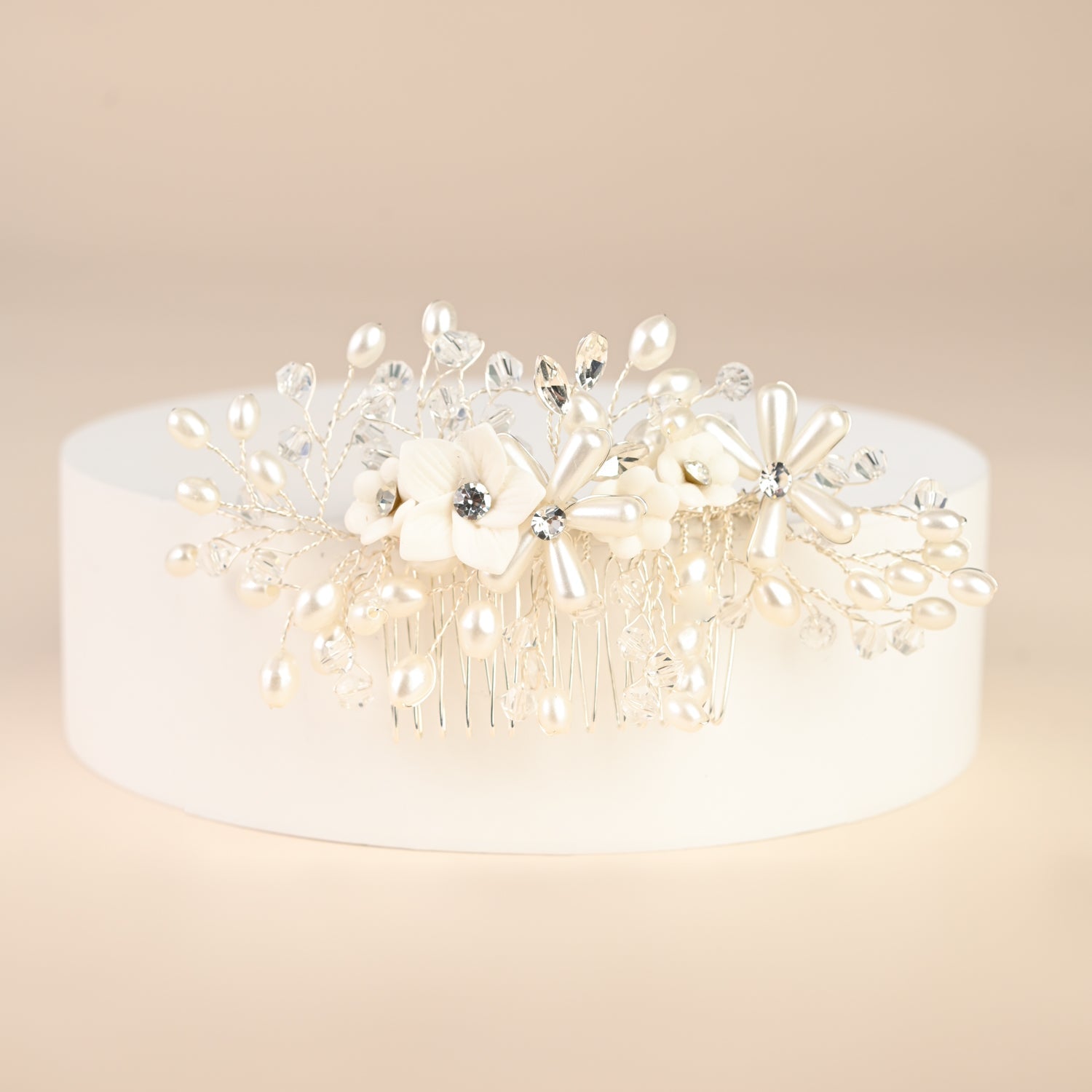 Our Pearl Blossom Dainty Flower and Crystal Comb is a breathtaking and delicate adornment that embodies the timeless beauty of nature. The Pearl Blossom Comb features dainty white flowers delicately stitched to a flexible metal comb providing a high-quality way of attaching to any hairstyle with ease and comfort. Each flower is adorned with shimmering crystals surrounded by luminous pearls, creating a harmonious symphony of radiance and elegance.