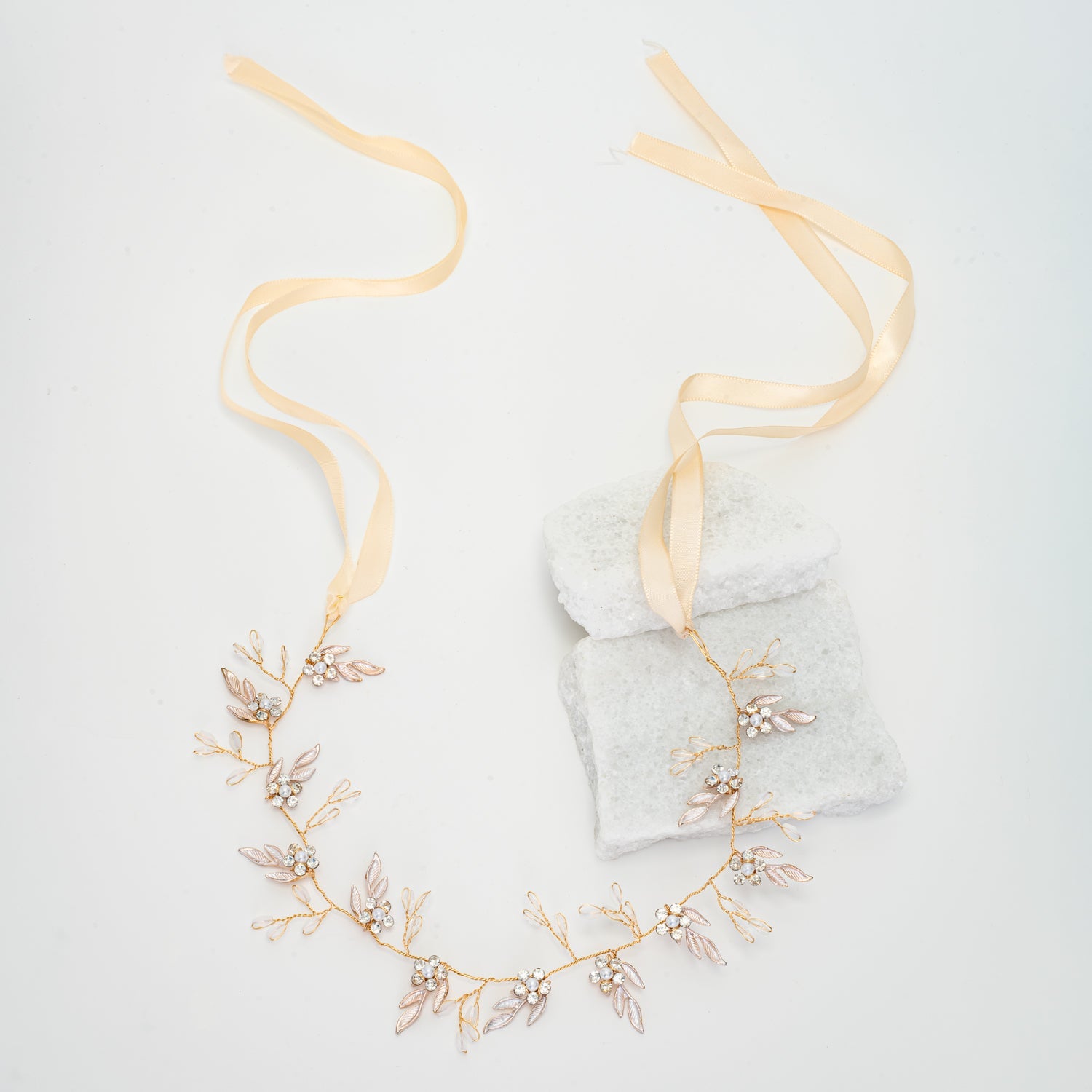 The Petite Floral Crystal and Pearl Silk Ribbon Headband is a breathtaking accessory that embodies the essence of beauty, making it the perfect adornment for a radiant bride on her special day. A removable, delicately woven champagne silk ribbon embraces your crown, ensuring a comfortable and secure fit. The ethereal petals of the petite floral are embellished with shimmering crystals and a single pearl at the center, while the lustrous leaves glow in subtle shades of dusty rose. These exquisite elements come together to create a captivating harmony, reflecting the journey of strength and resilience.
