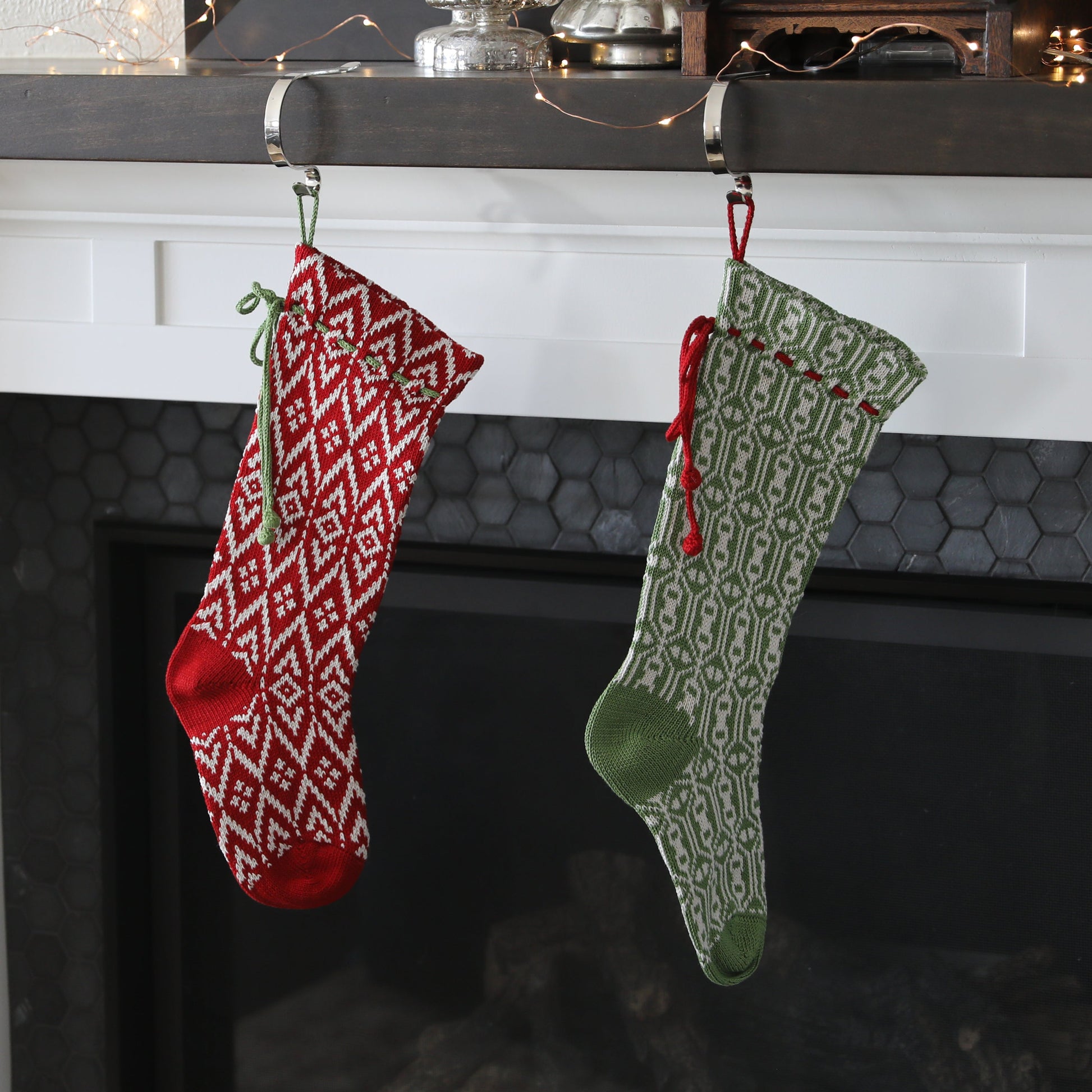 Featuring a beautifully intricate red and cream pattern, this stocking is a true standout with its detailed geometric design that exudes a timeless, classic appeal. The rich red is complemented by the green laces woven through the top, tied in a charming bow that adds a pop of color and a festive finish.