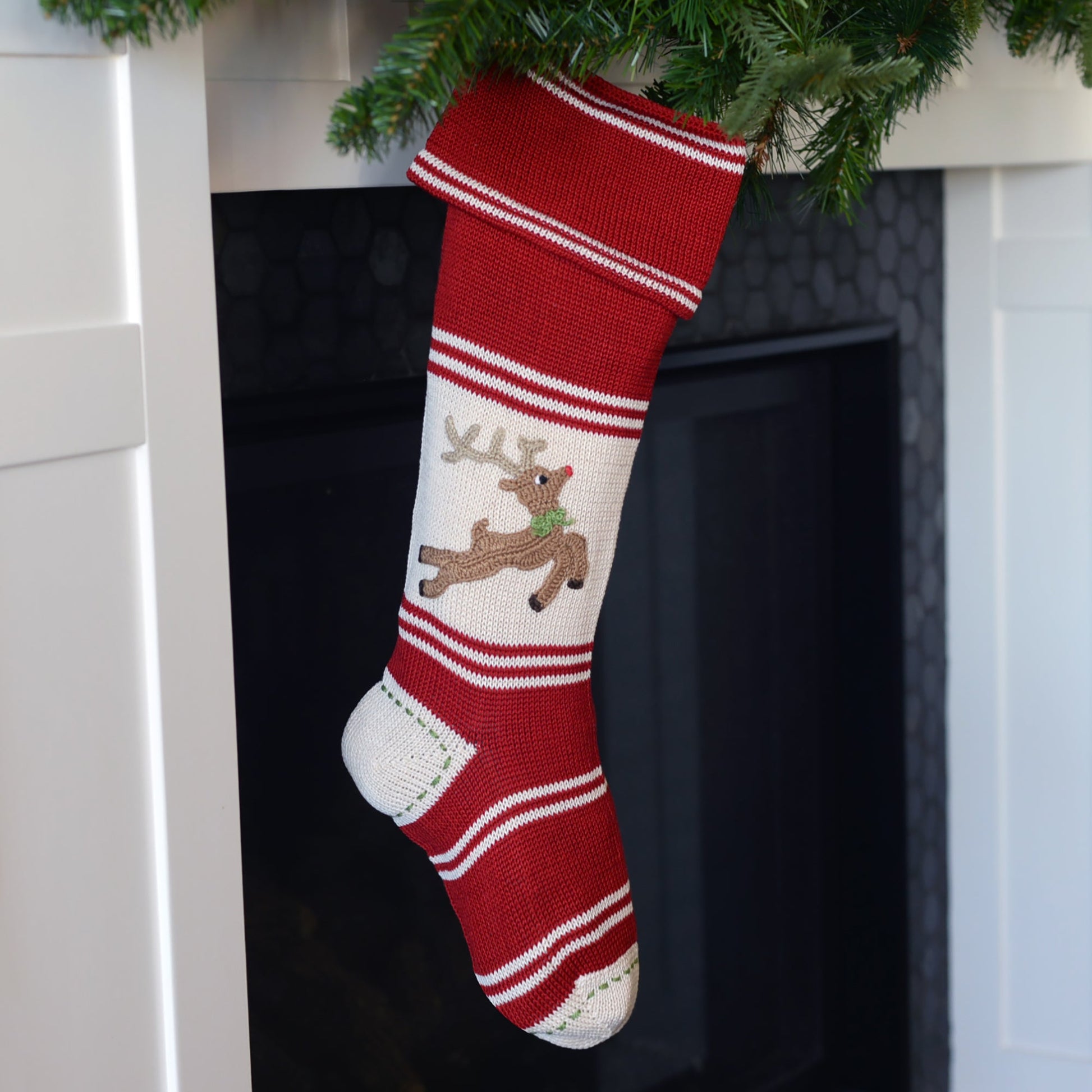 Add a festive touch to your holiday decor with this charming knit holiday stocking. This beautifully crafted stocking features a classic red and ivory striped pattern, accented by a delightful crochet reindeer.
