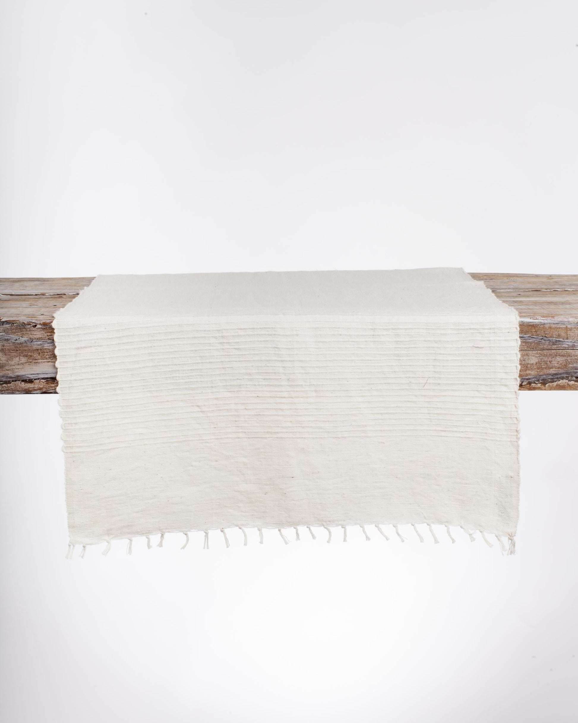 -spun cotton, delicate ribbed accents and tasseled ends give a rich depth of texture to this neutral yet elegant table runner. Ethically made in Ethiopia from 100% locally sourced cotton.