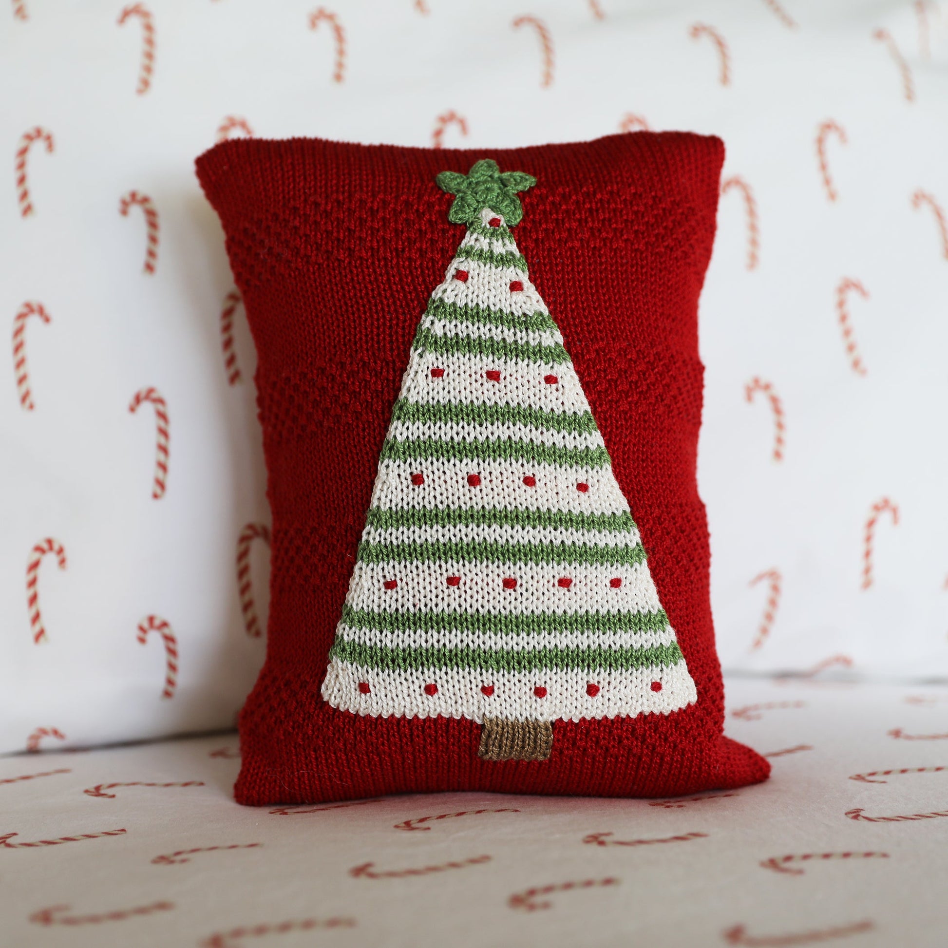 This little knit holiday throw pillow features a charming Christmas tree design, adding a festive touch to your home decor. The tree is beautifully decorated with stripes of green and white, dotted with red accents, and topped with a star, all set against a rich red background.