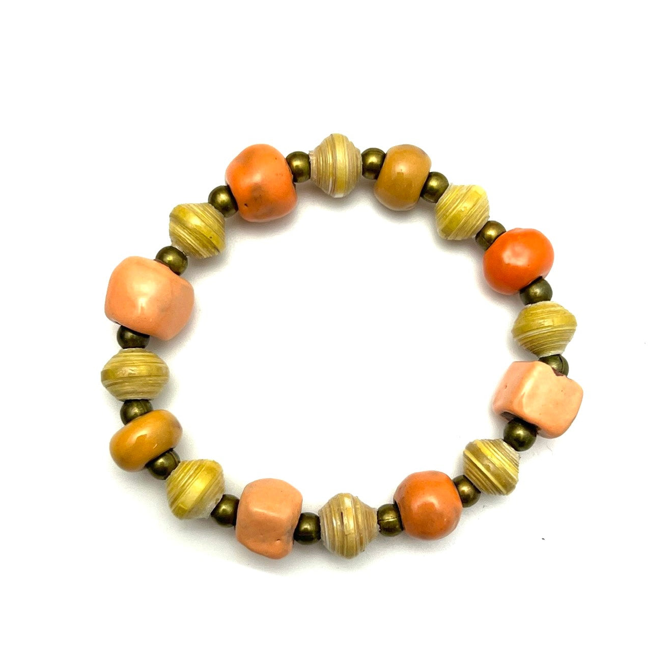 A beautiful orange and yellow tone necklace that pairs ceramic with recycled paper.