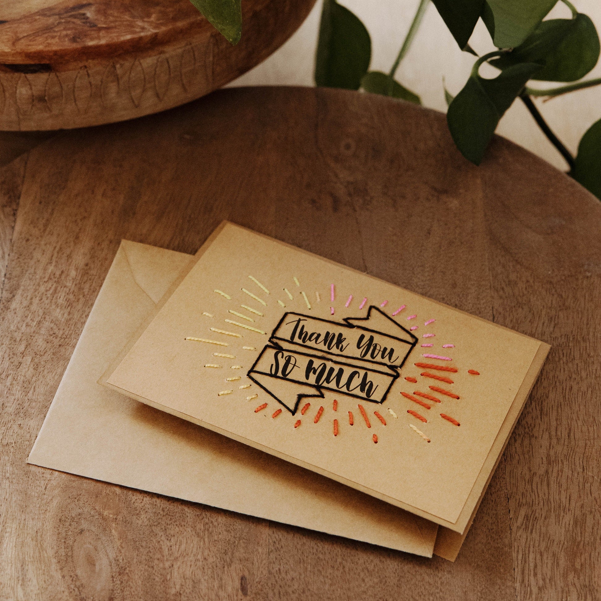 Set of 4 assorted cards with vibrant, colorful stitching patterns and message: "thank you so much"